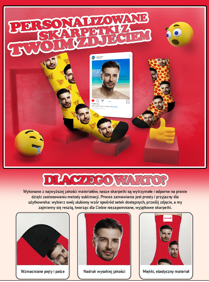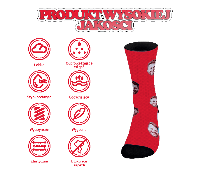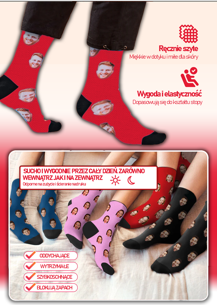 Hand-stitched, personalized socks with high-quality sublimation printing with the possibility of personalization to enrich the product with your own image or an image from a photo. The material is durable, a breathable at the same time which prevents feet from sweating and makes it suitable for all seasons closet.