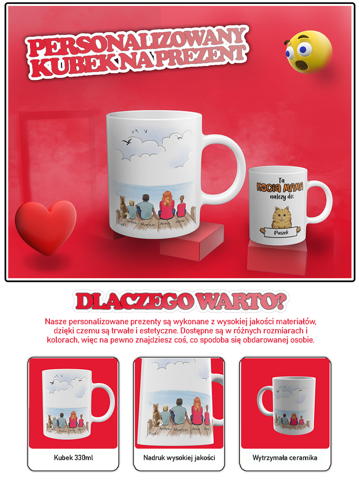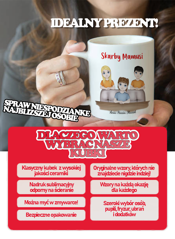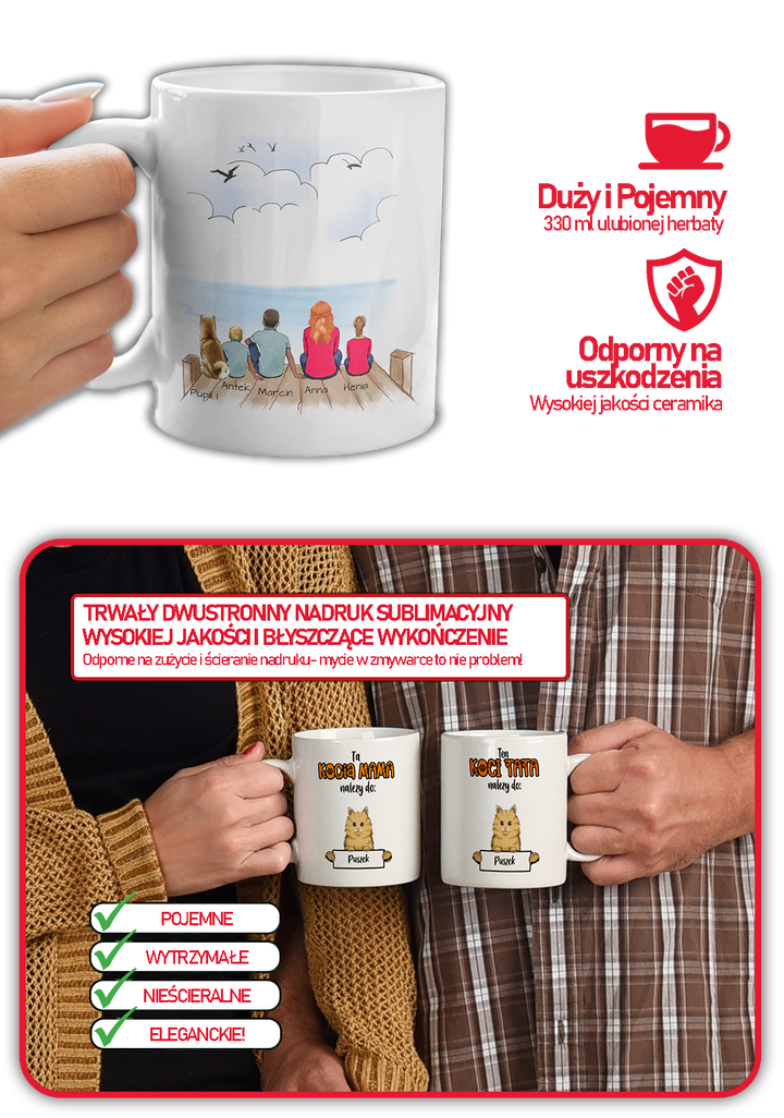 The mug is made of high quality ceramicpersonalized with polymer imprint, good withstanding dishwasher washing, guarantees that it will serve for a long time without losing the color intensity of the print. Its ergonomic shape and carefully crafted handle ensure comfort and safety during use.